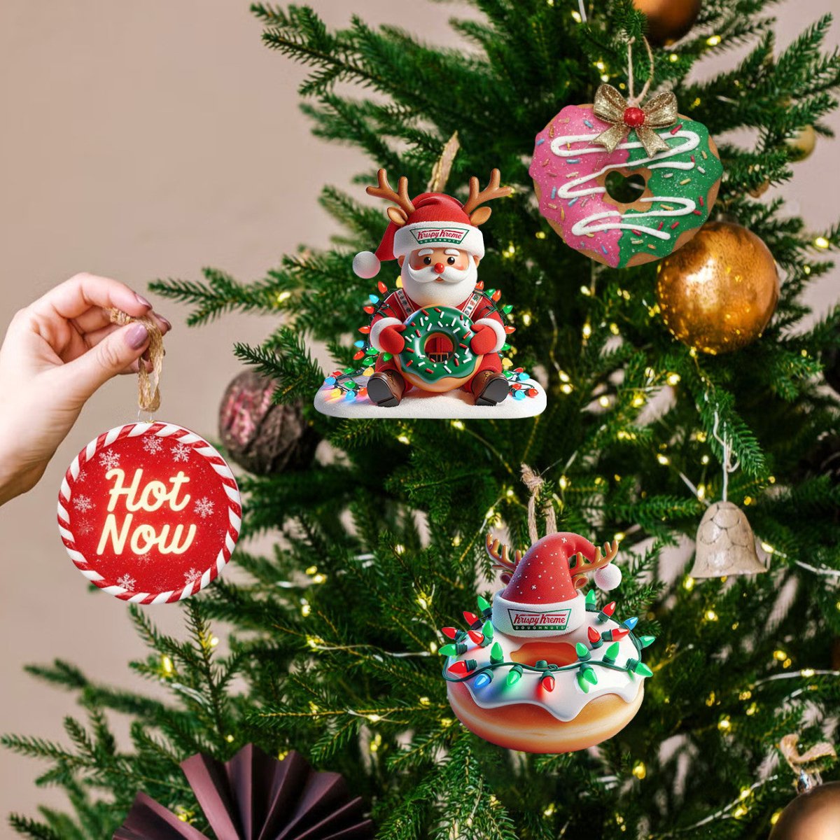 Each ornament from Santa’s doughnut sleigh and elf bakers to “Hot Now” signs, pink-frosted rings, coffee mugs, and delivery trucks captures the warm, sugary charm of Krispy Kreme in full Christmas style. Glossy finishes, rich colors, and a sprinkle of sparkle make every piece look good enough to eat.
